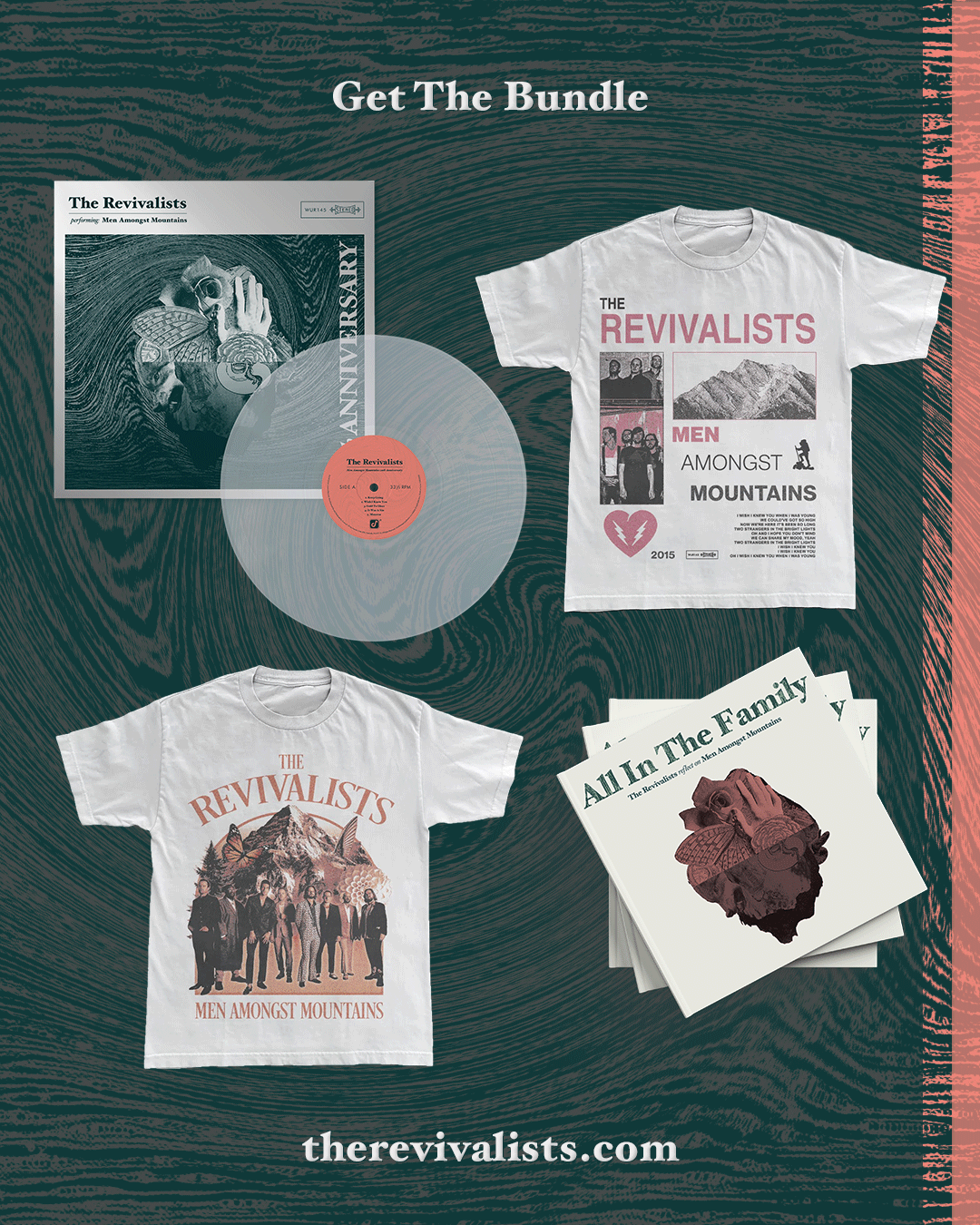 The Revivalists revealed a limited edition bundle of their celebratory release of their hit album Men Amongst Mountains with new t-shirts and retrospective book exclusive to the release. Men Amongst Mountains 10th Anniversary drops on wax in 180-gram crystal vinyl with a reimagined foil packing and is accompanied by a coffee table book containing archival photos, stories from the band and fans for that time in the band’s career and more. Shop the bundle and select your accompanying t-shirts to go along with the vinyl and book.